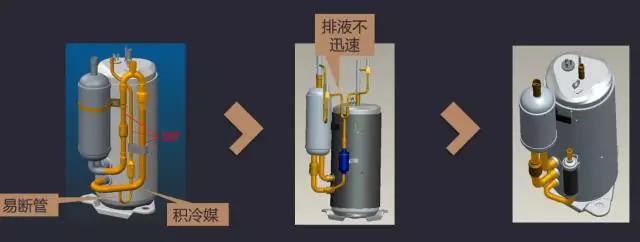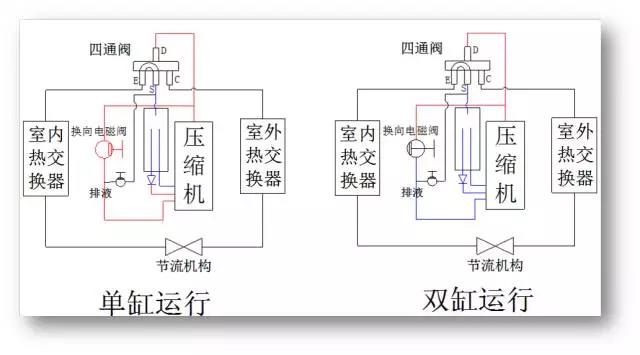 單缸運(yùn)行時(shí)下氣缸連接管和排氣管相連且無冷媒流動(dòng),長期運(yùn)行時(shí)會(huì)造成積冷媒,若此時(shí)切換雙缸運(yùn)行,該堆積的冷媒會(huì)直接被吸入下氣缸造成壓縮機(jī)液擊。